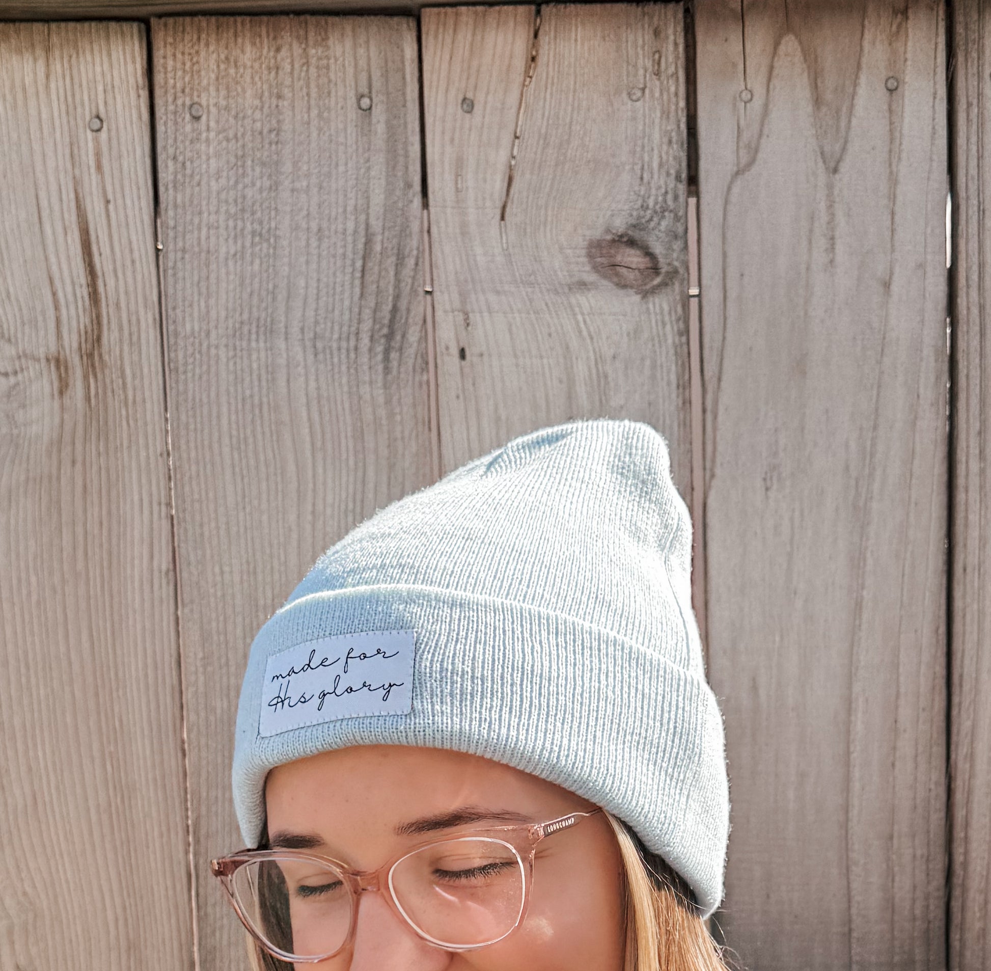 Christian Made for His glory baby blue beanie.