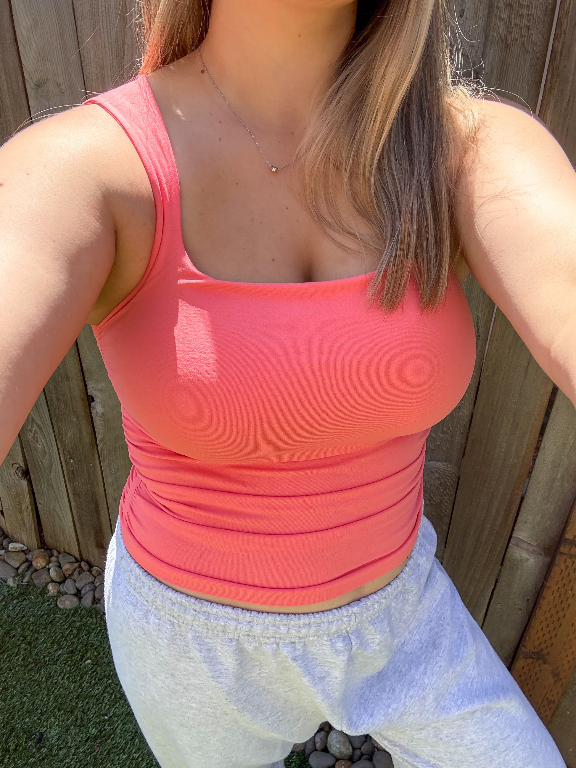 Buttery-soft square neck tank in delicate Cherry Limeade. Very flattering shirred detail on the side. Premium quality you'll absolutely LOVE.